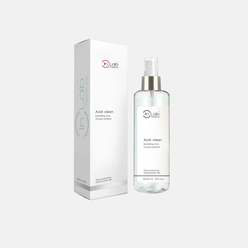 Refresh availabilityAcid Clean by InLab is a professional facial exfoliating toner formulated to deeply cleanse and gently renew the skin. Its action combines Gluconolactone (a new-generation PHA) and 3% Niacinamide, providing effective yet non-irritating exfoliation, suitable even for sensitive skin.