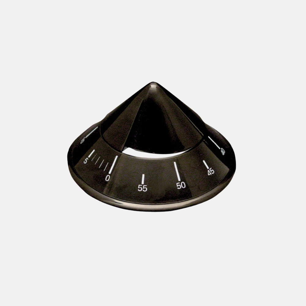 Made of durable black plastic, it features a stable, compact conical design that prevents movement on the work surface. The clear numerical markings allow precise minute-by-minute adjustments for up to 60 minutes.