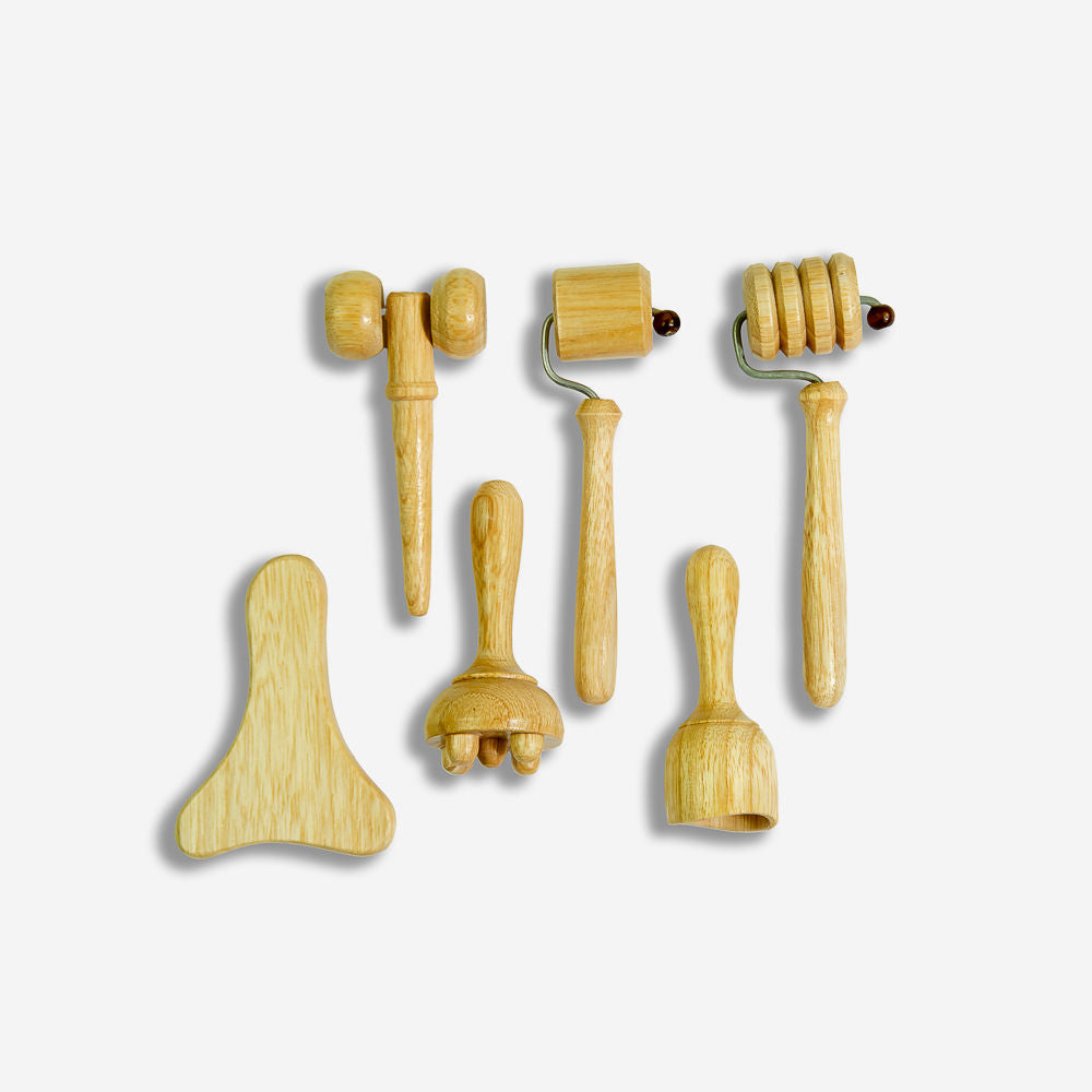 Además contamos con un kit de maderoterapia facial que está compuesto por 6 piezas para cubrir todas las zonas del rostro, con este kit ayudamos a producir colágeno y elastina de forma natural, atenuar las líneas de expresión y reducir la grasa localizada de la zona de la papada.