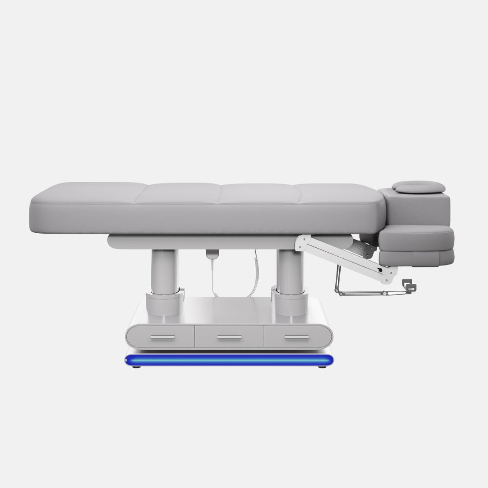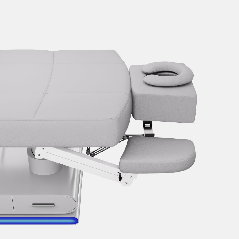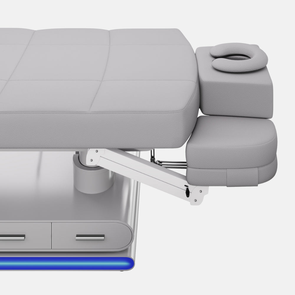 La struttura in metallo è rivestita in MDF laccato grigio e integra 6 cassetti (3 per lato) per una gestione ottimale dello spazio. I braccioli regolabili in altezza sono dotati di cuscini rimovibili e regolabili tramite pistone a gas. Il poggiatesta, removibile e multiposizione, include foro facciale con cuscino a ferro di cavallo e cuscino rettangolare.