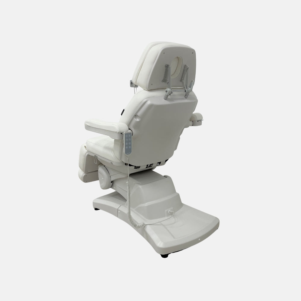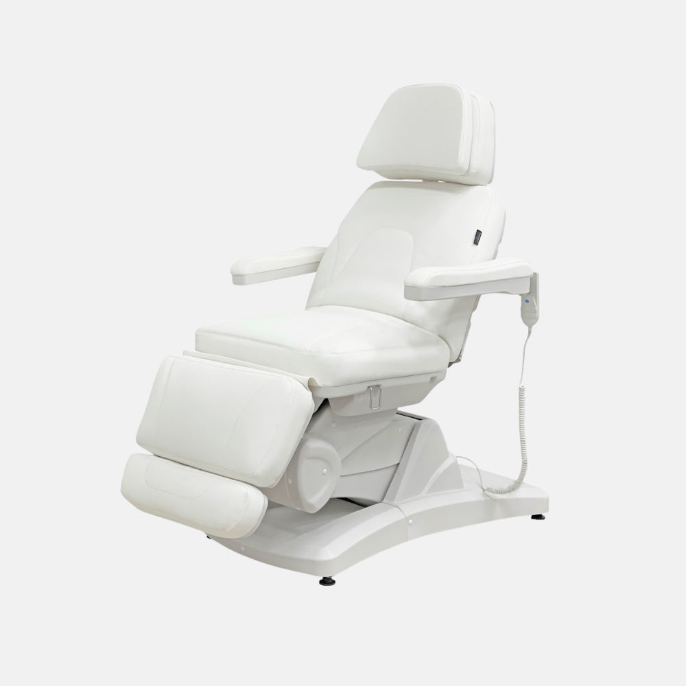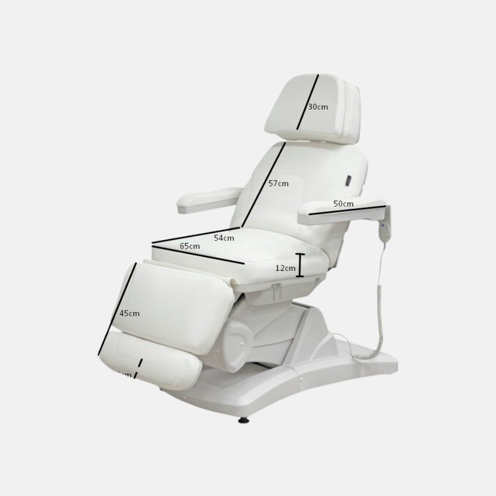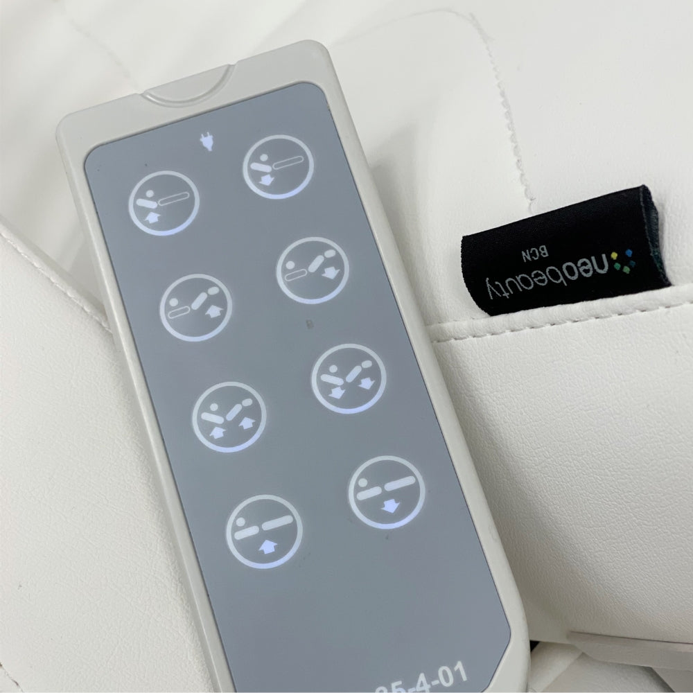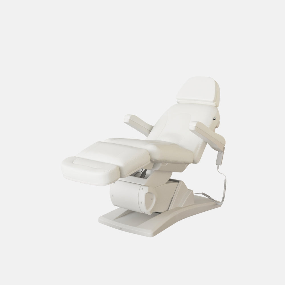 Pero no se trata solo de apariencia: la camilla Cristina Confort incluye 4 motores eléctricos que permiten regular la altura, la inclinación del asiento, la sección de pies y el respaldo con precisión. El mando cableado incorpora botones retroiluminados para un uso cómodo, incluso en ambientes con luz tenue.