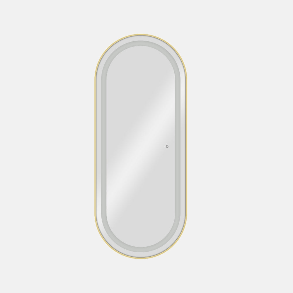 - Diseño ovalado moderno con marco en aluminio dorado.