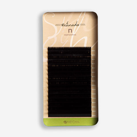 Extensiones de pestañas de seda sintética. Cada caja contiene 16 tiras de extensiones. Esta curvatura permite mayor adhesión a la pestaña natural por su larga base. Perfecta para los diseños de ardilla y ojo de gato.