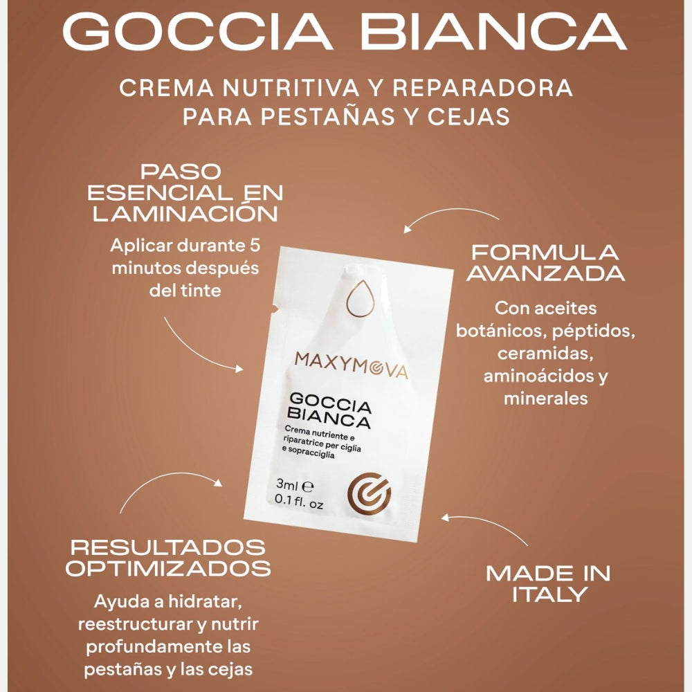 Actualizar disponibilidadGoccia Bianca es una crema-sérum nutritiva de textura rica, diseñada para utilizarse tras el tratamiento de laminación o tinte de pestañas y cejas. Su fórmula avanzada proporciona una hidratación intensa, suavidad inmediata y mejora visible del aspecto del vello, gracias a su combinación de aceites botánicos, péptidos, ceramidas y un exclusivo complejo mineral fermentado.