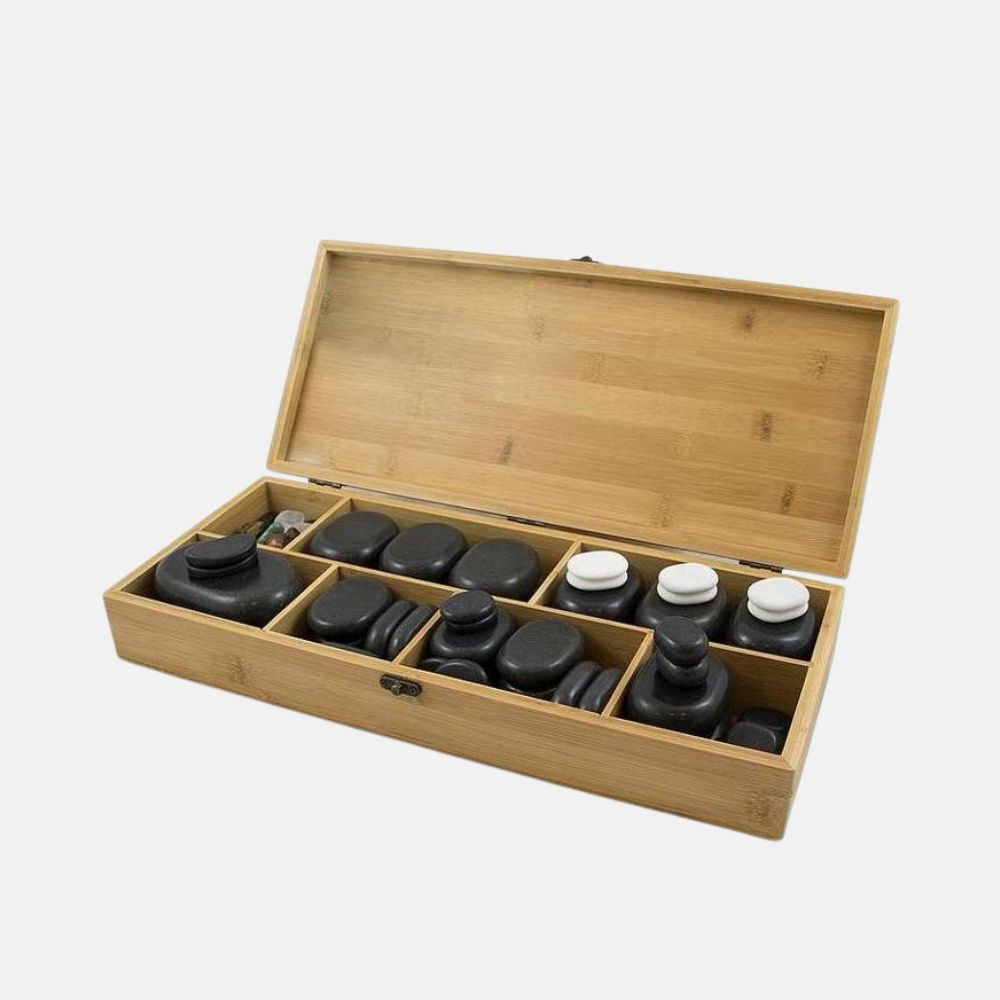 Relajación profunda y alivio muscular, gracias a la capacidad del basalto para retener y distribuir el calor de forma uniforme.