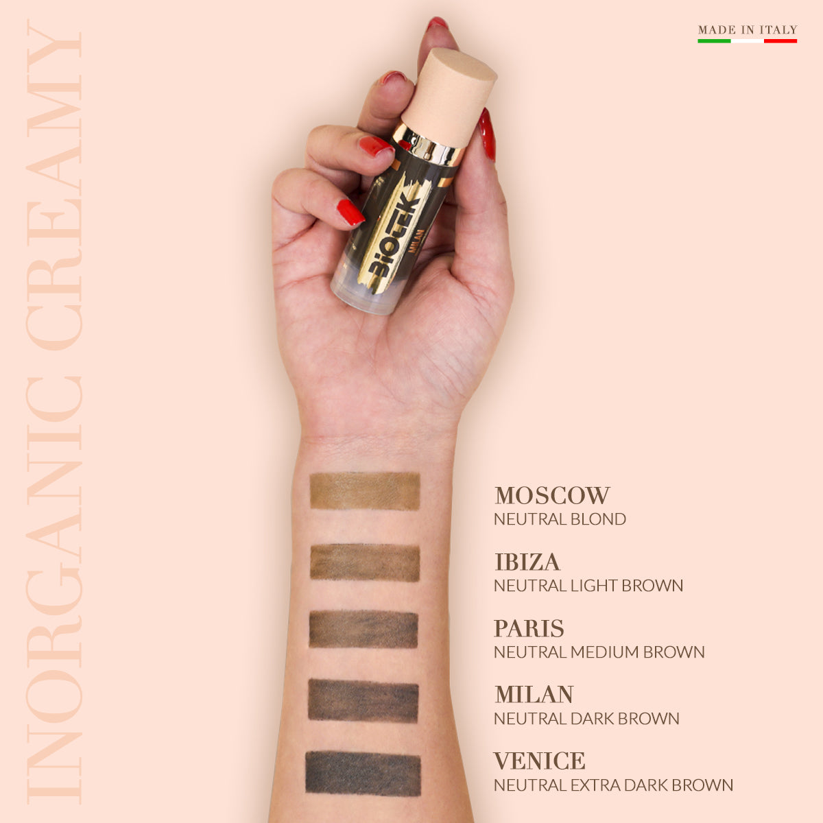 Milan: Marrón oscuro neutro para cejas. Ideal para pieles neutras (sin tendencia al rojo o al verde) con cejas marrón oscuro.