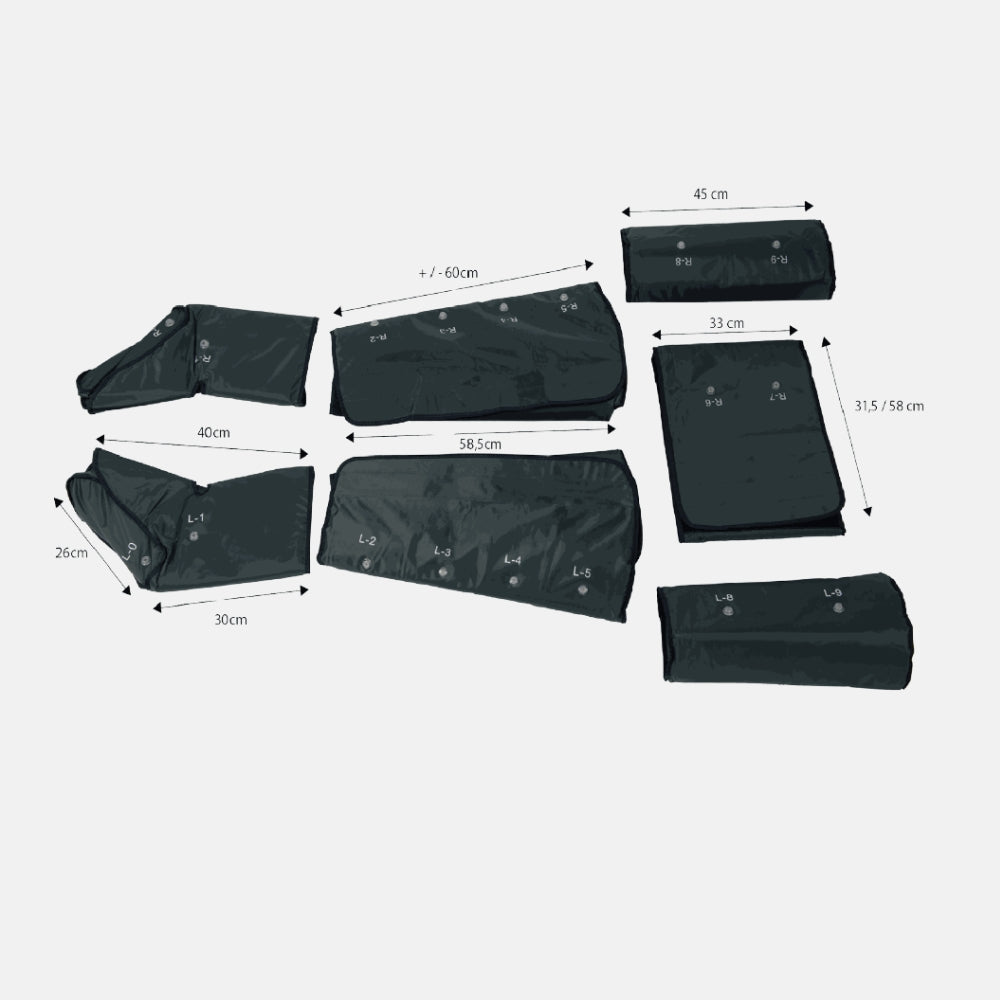 Incluye botas, perneras, faja abdominal y mangas para brazos. Además, cuenta con una práctica manta de almacenaje para cables, facilitando su uso y organización.