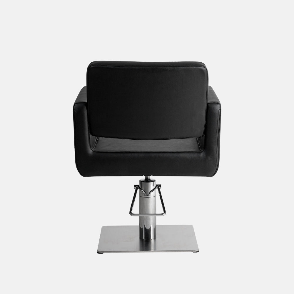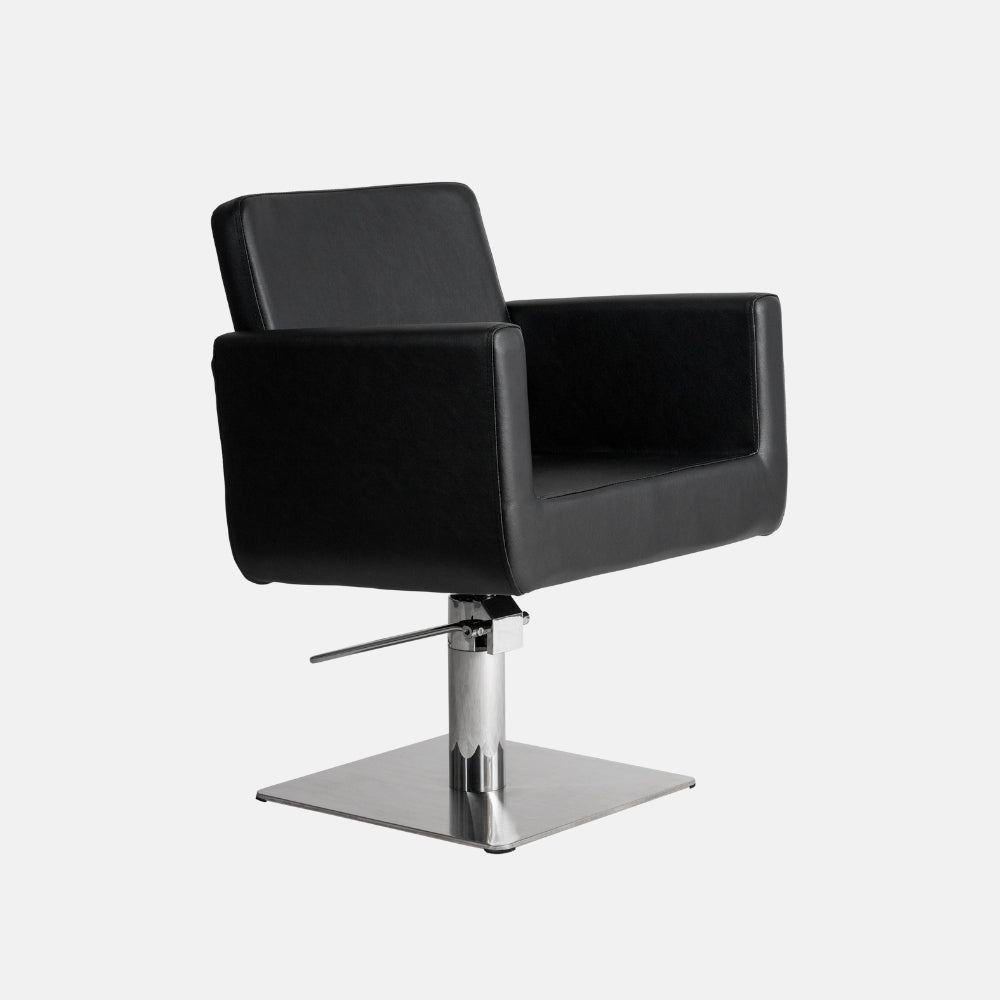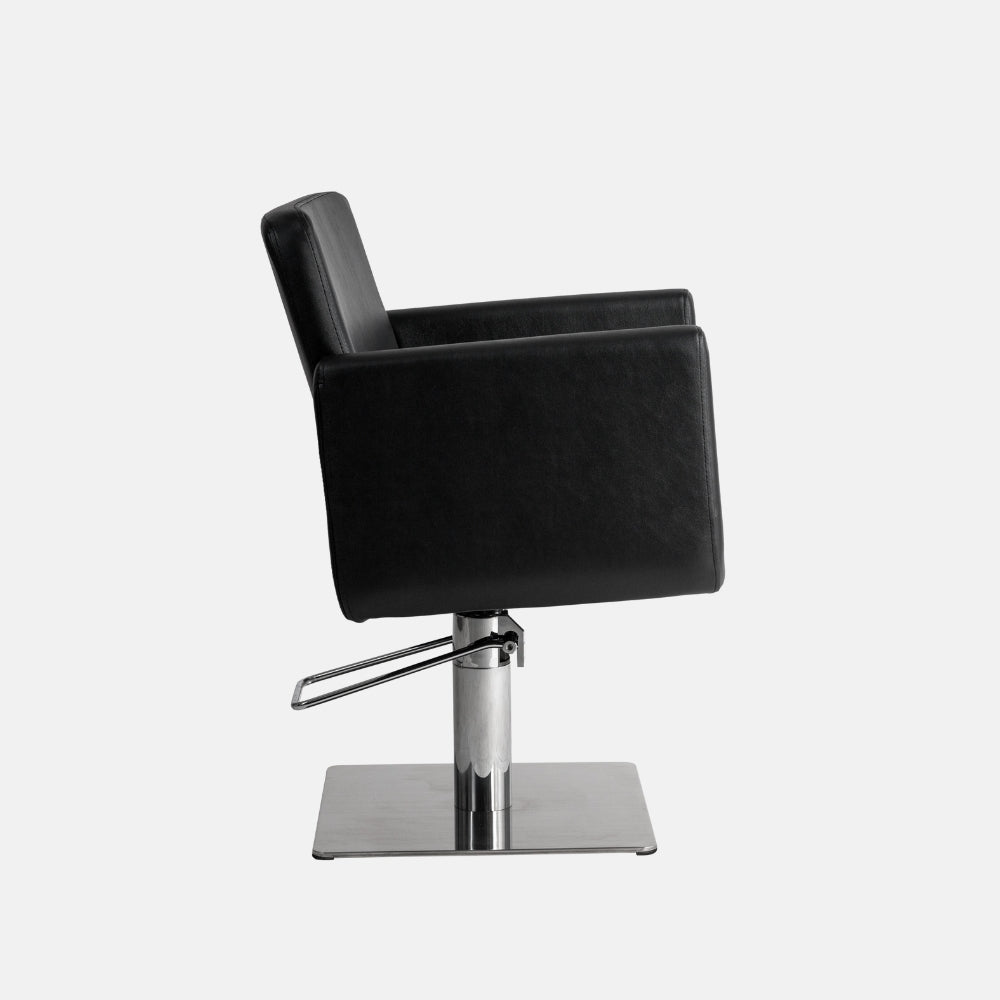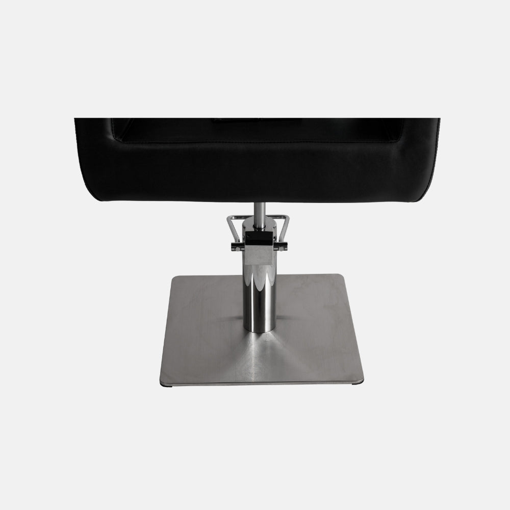 Base cuadrada de acero inoxidable cromado, de diseño estilizado que aporta un toque moderno al espacio de corte. Su planta permite mayor movilidad alrededor del cliente.