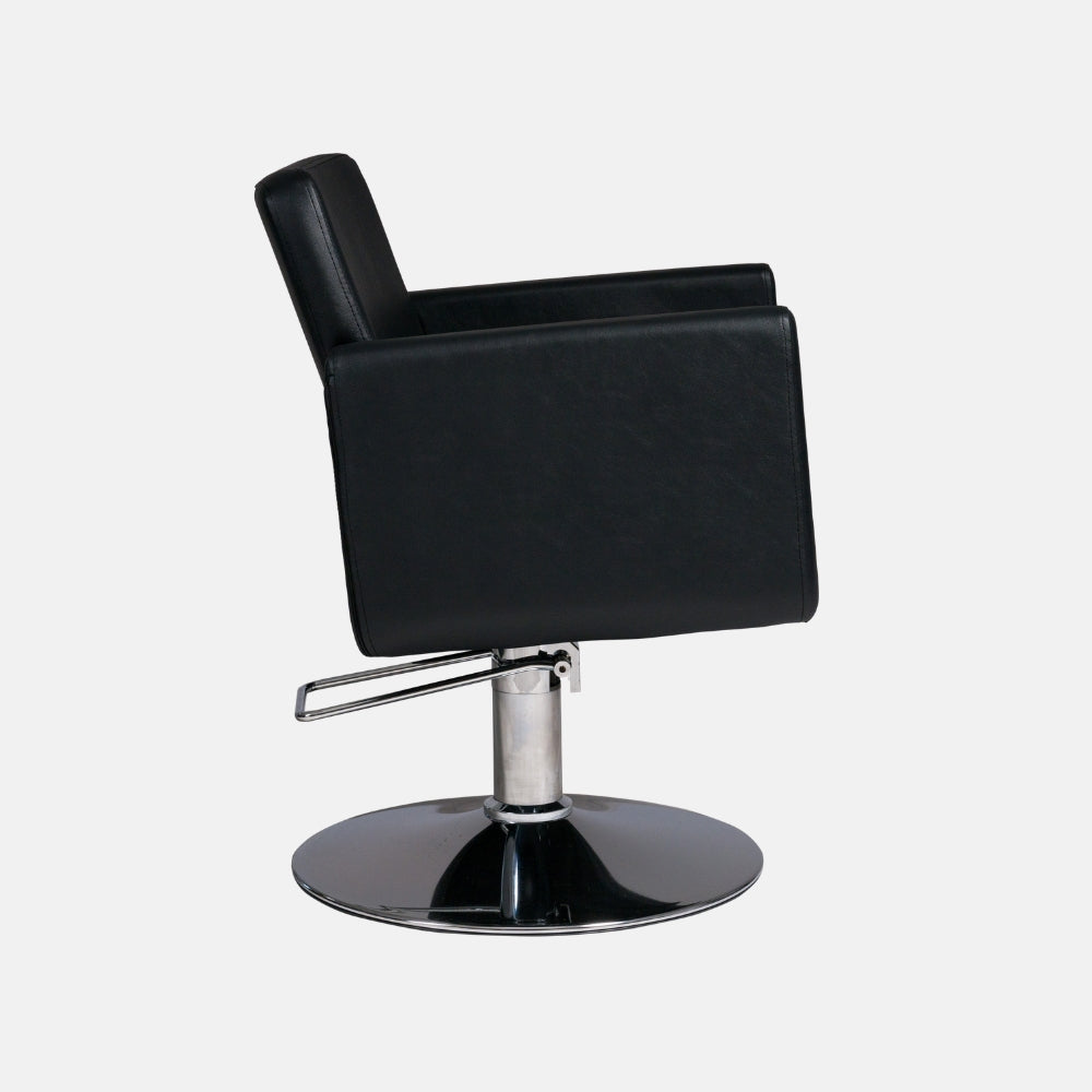 Gracias a su diseño sin juntas, evita la acumulación de pelo, facilitando una limpieza rápida e higiénica. La base metálica redonda ultrafina, con acabado cromado, permite mayor movilidad y cercanía al cliente. La bomba hidráulica bloqueable de alta calidad asegura un ajuste de altura preciso y seguro. El tapizado en PVC negro completa su estética profesional y elegante.