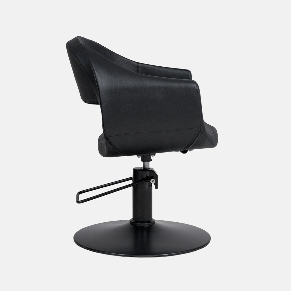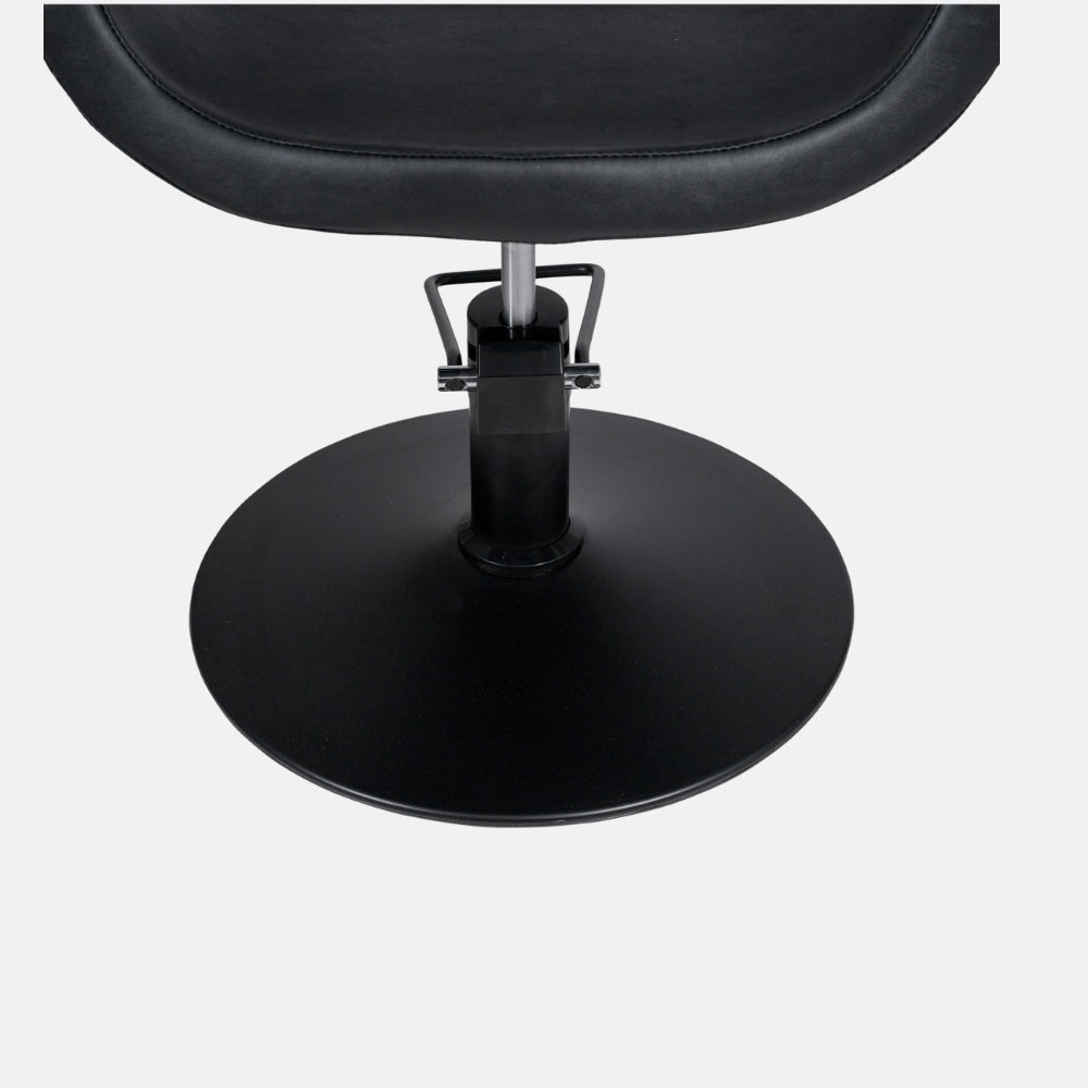 Su asiento monoblock cuenta con chasis metálico interno y espuma de poliuretano inyectado de alta densidad, lo que asegura resistencia y confort duradero, sin deformaciones con el tiempo. La base circular extraplana en color negro mate ofrece estabilidad y comodidad para el profesional, especialmente en zonas reducidas. Incorpora bomba hidráulica de gran calidad con freno para ajustar la altura de forma precisa y segura.