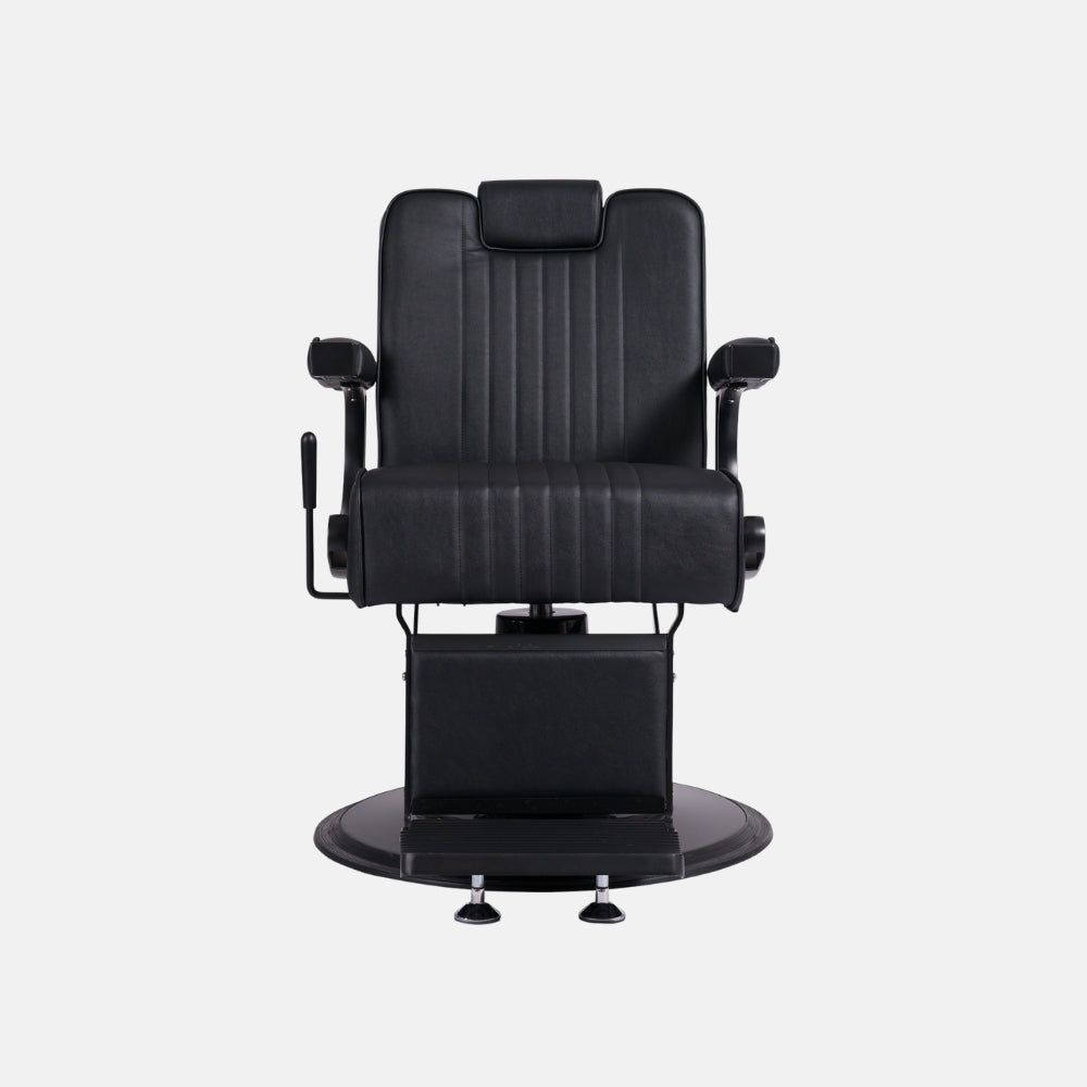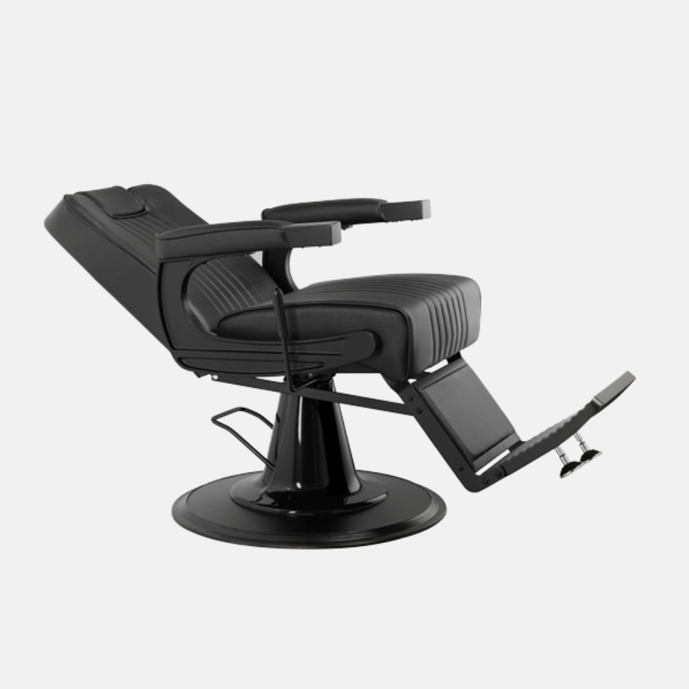 El asiento cuenta con espuma de alta densidad y muelles integrados para un confort superior incluso durante largas sesiones. El respaldo y el reposapiés son reclinables para adaptarse a diferentes tipos de servicios, y el reposacabezas es extensible. El tapizado en PVC negro, con costuras verticales, combina estilo y durabilidad, ideal para un uso intensivo.
