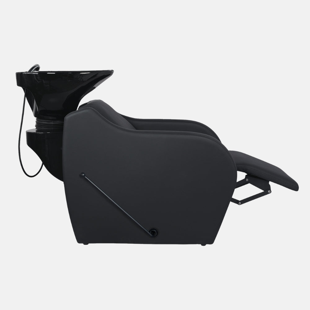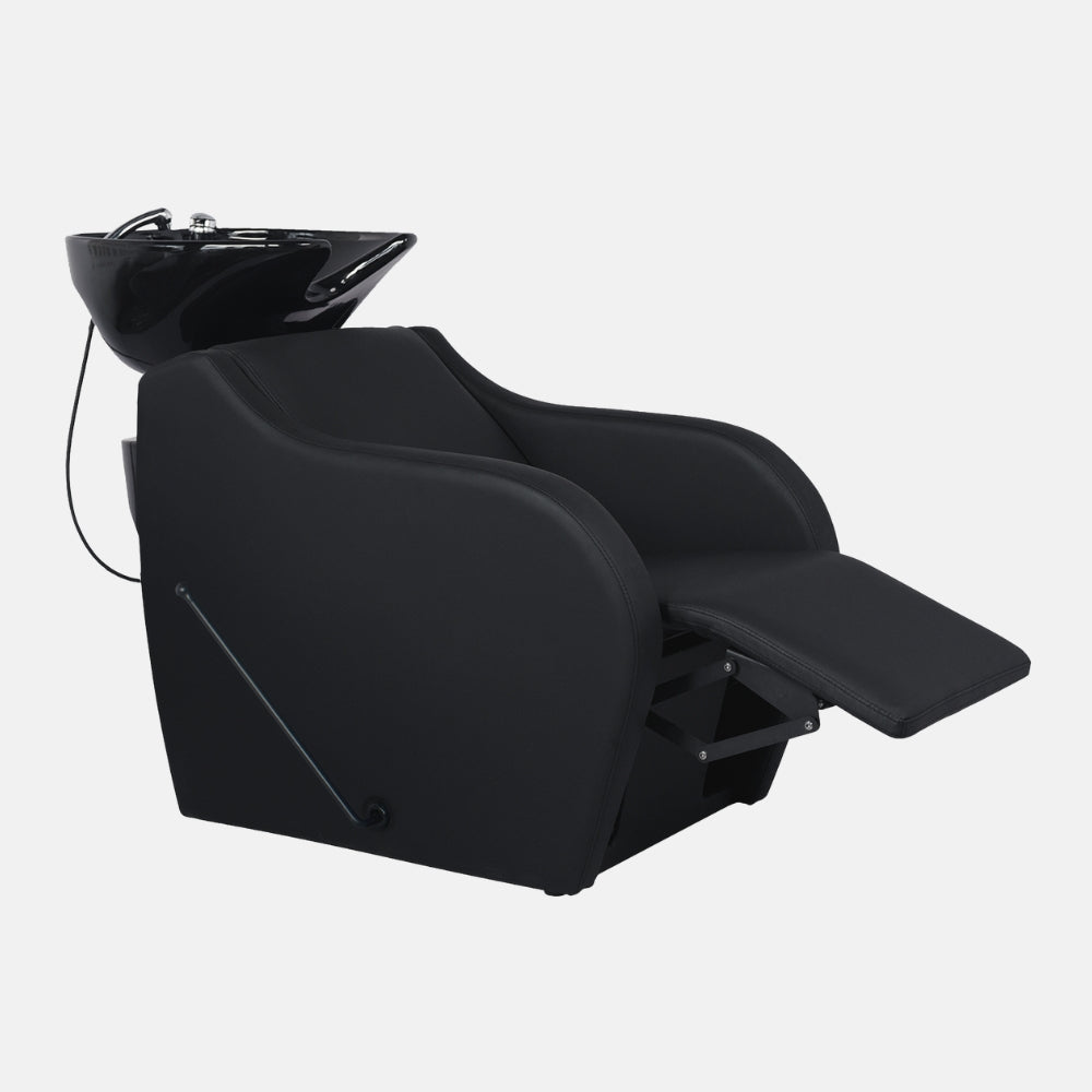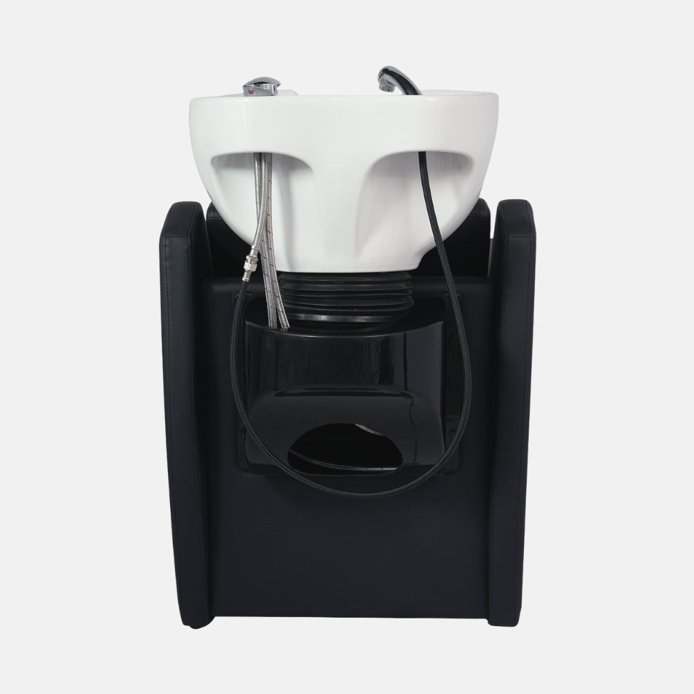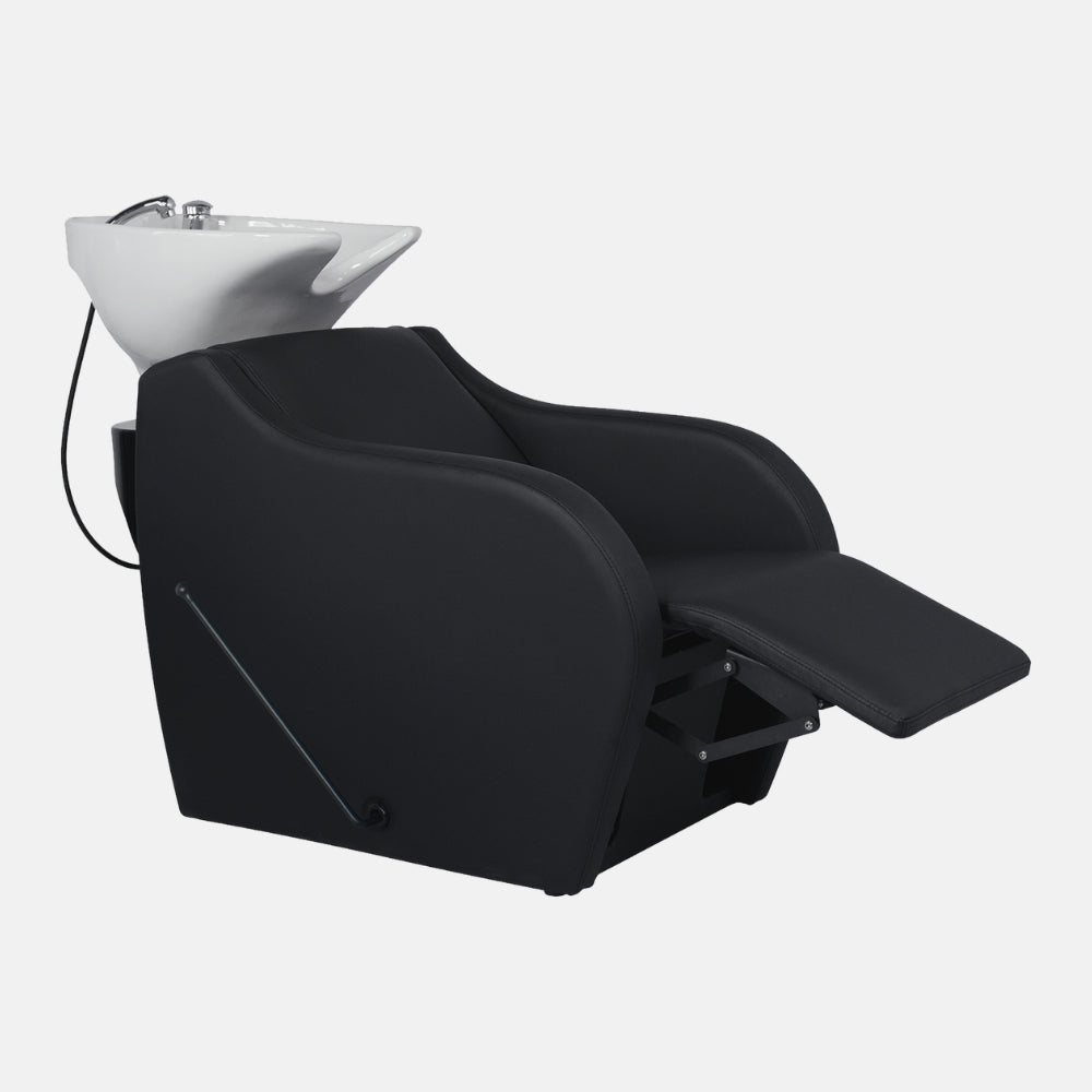 Versatilidade estética adaptada ao salão: disponível em duas variantes de cuba (branco ou preto) para se integrar no estilo do espaço; estofamento em PVC preto de alta qualidade, fácil de limpar, ideal para uso profissional.
