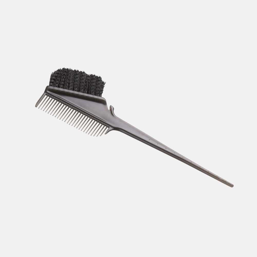 A cabeça possui cerdas sintéticas pretas de alta densidade, ideais para aplicar tintas, máscaras ou tratamentos capilares com cobertura total e sem desperdício. O pente lateral, incorporado na estrutura do pincel, permite desembaraçar o cabelo durante a aplicação e espalhar o produto de forma eficiente, poupando tempo em serviços técnicos.